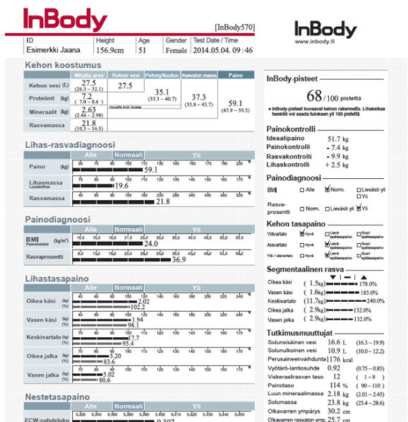Diagnoosissa verrataan kokonaispainon, lihasten painon ja rasvan painon suhdetta. Lisäksi mittaustulokset näyttävät miltä sinun tulokset näyttävät verrattuna saman ikäisen ja saman pituisen henkilön vastaaviin verrokkituloksiin.