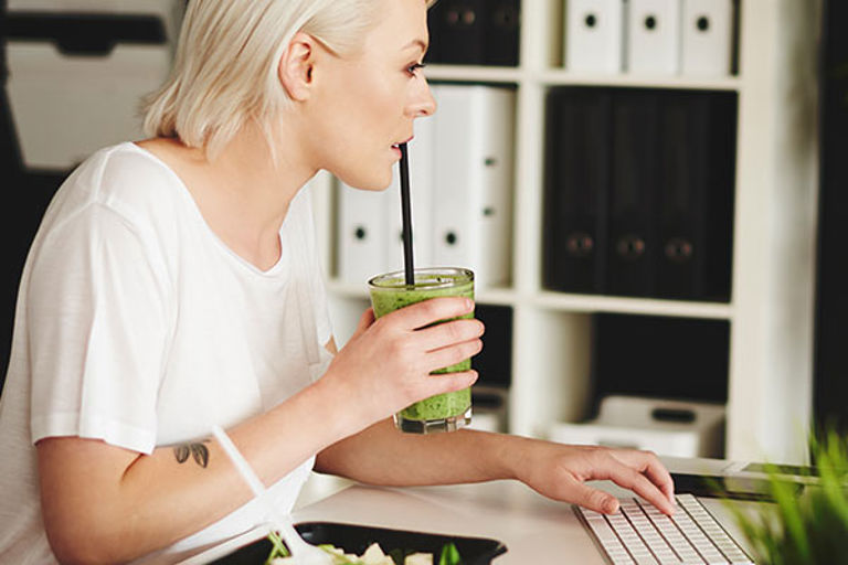 Jos syöminen tuntuu aluksi hankalalta, voit yrittää juoda aterian töiden lomassa. Esimerkiksi smoothie, jossa on marjoja, jogurttia tai rahkaa, kuituja hiutaleista sekä pehmeää rasvaa kuten avokadoa tai pähkinöitä, sopii ateriaksi, kunhan pitää huolen riittävästä määrästä. Tavallinen lasillinen ei riitä.