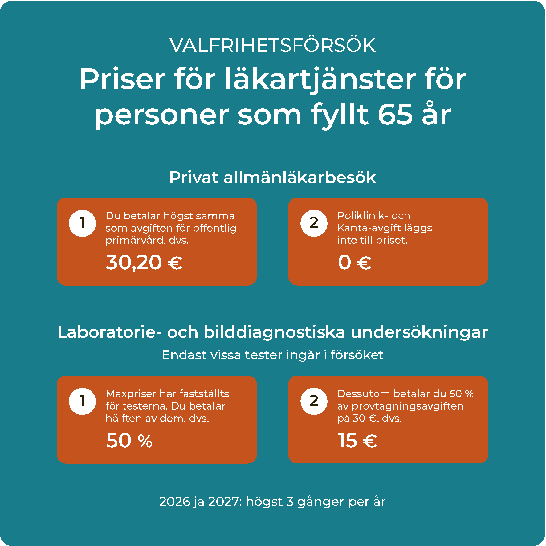 - Inom försöket med valfrihet kan personer som fyllt 65 år besöka en privat allmänläkare, som de själva valt bland läkare som deltar i försöket, till samma pris som inom den offentliga hälsovården (30,20 € per besök/2026). Inga extra kostnader tillkommer.